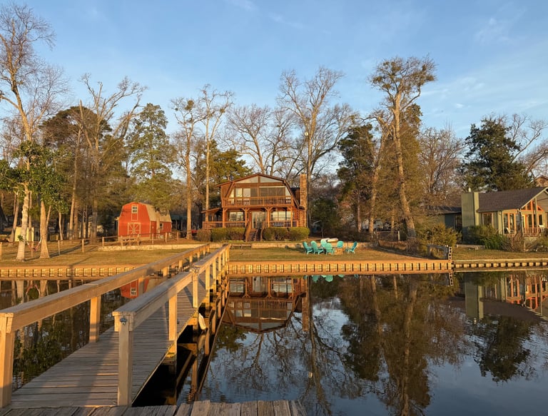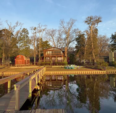 Callender Blue is a cozy cabin in the piney woods of East Texas, a perfect lake escape for families, groups, couples, or remote workers.
