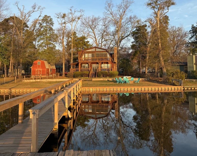 A cozy cabin retreat where calm waters meet warm fireside moments.